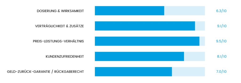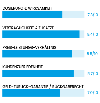 - Kundenzufriedenheit: Wie zufrieden sind Anwender mit dem Produkt? Wir haben mit Hilfe eines technischen Programms alle Kundenbewertungen in Online-Apotheken und anderen Bewertungsportalen erfasst, auf Echtheit überprüft und ausgewertet.